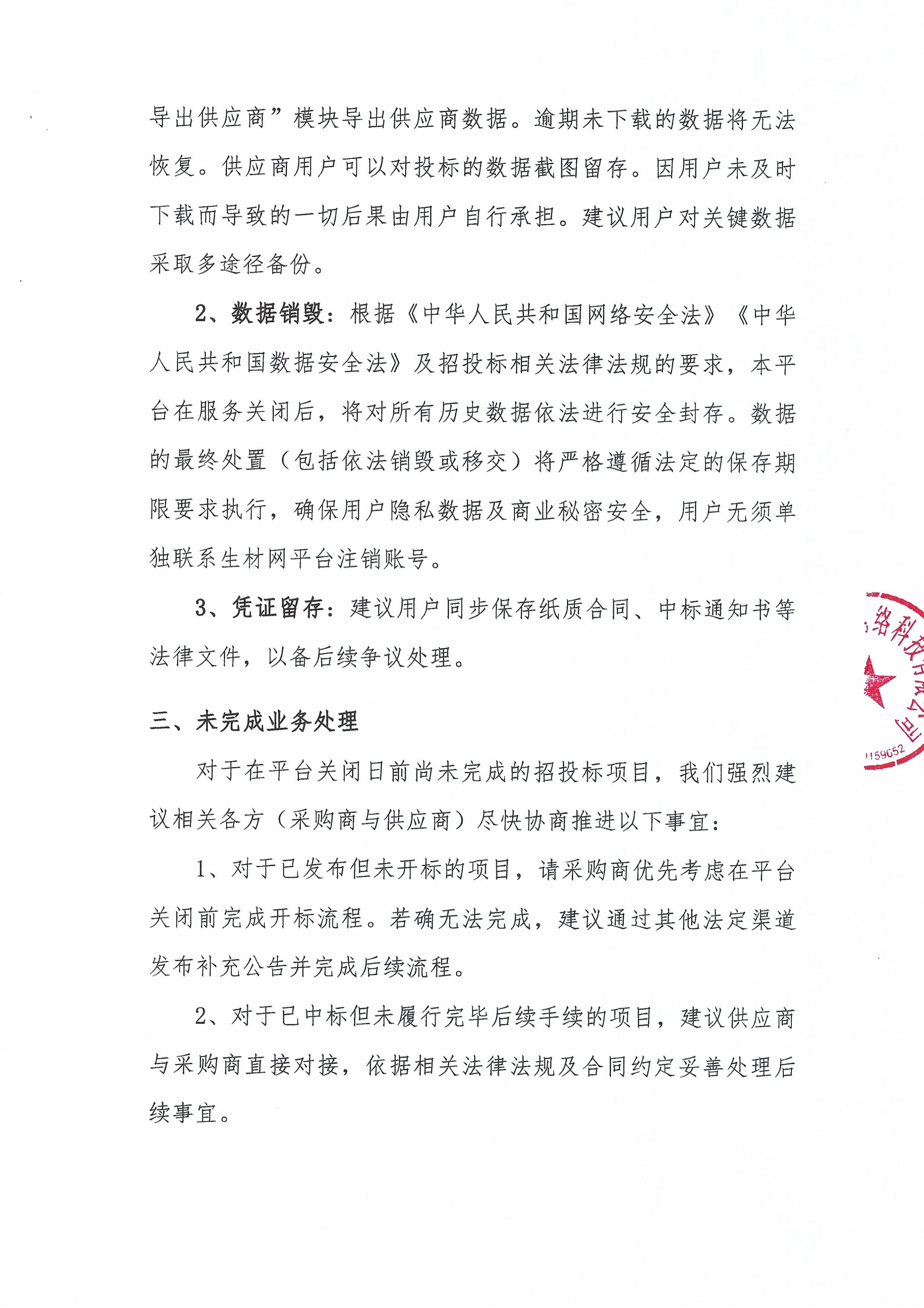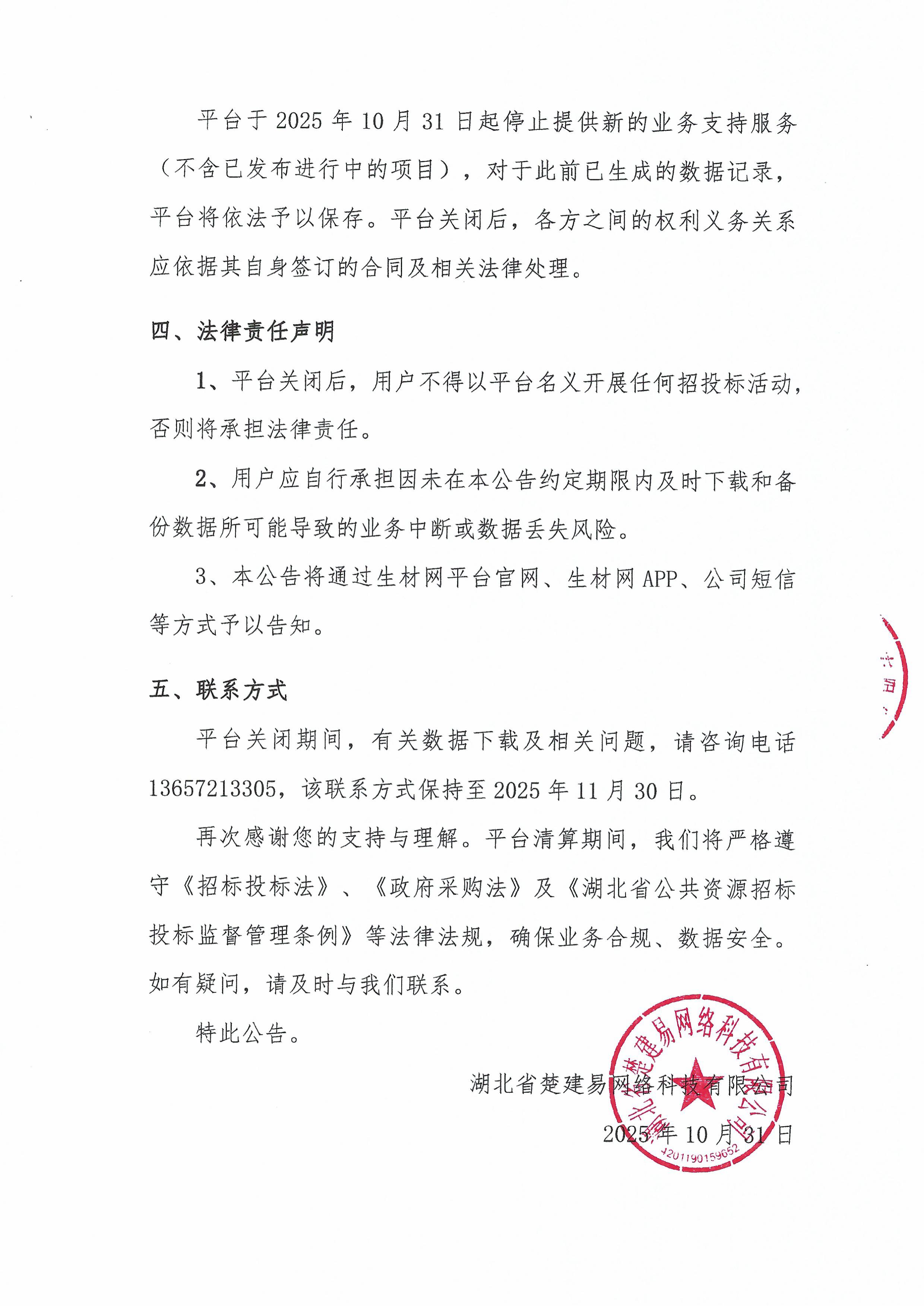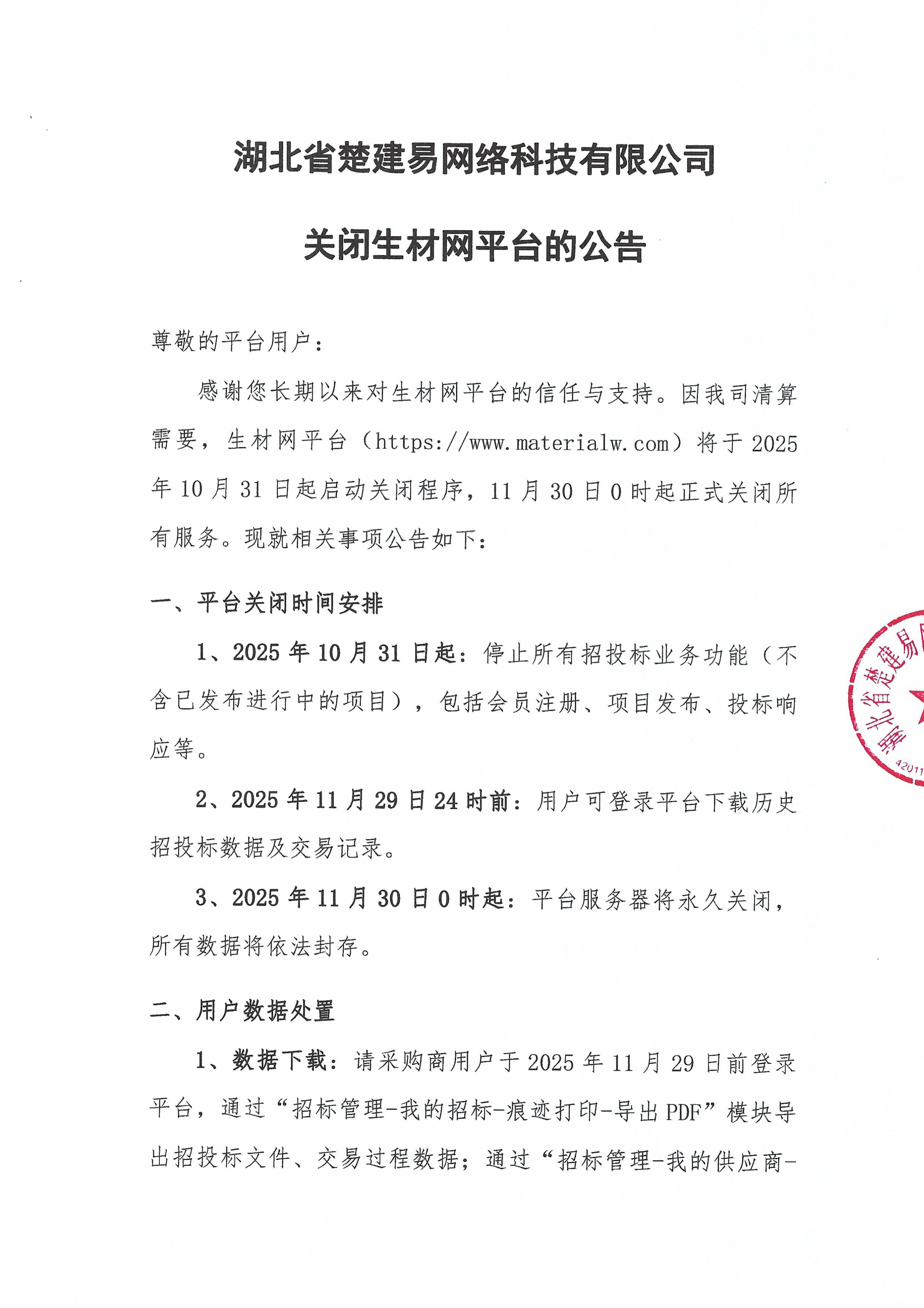 湖北省楚建易网络科技有限公司关闭生材网平台公告
